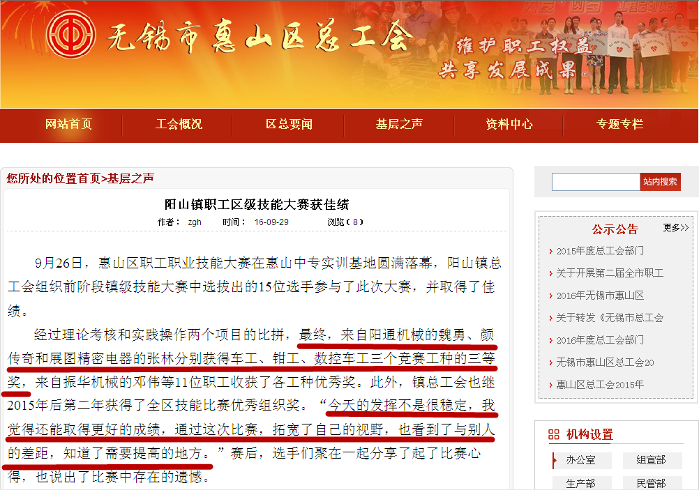 9月26日, 2016年惠山區(qū)職工職業(yè)技能大賽在惠山中等專業(yè)學(xué)校實(shí)訓(xùn)基地鳴鑼開(kāi)賽; 這次比賽結(jié)束獲獎(jiǎng)的顏傳奇、魏勇在“無(wú)錫市惠山區(qū)總工會(huì)”網(wǎng)站上刊登表?yè)P(yáng)。如圖所示