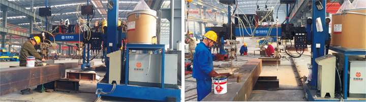 本機(jī)采用垂直電渣焊將內(nèi)隔板與周圍鋼板焊接牢固。有熔嘴式與熔絲式二種電渣焊可供客戶選擇。熔嘴式操作簡單,投資省,使用成本高;熔絲式操作復(fù)雜,投資大,使用成本低。